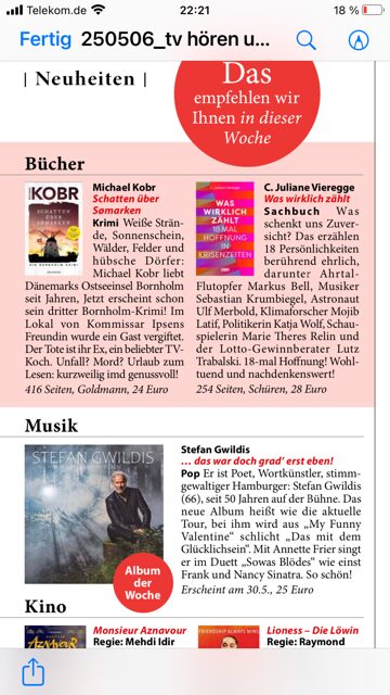 Nachmittags erfahre ich, dass die TV Hören und Sehen nächste Woche eine Buchempfehlung für „Was wirklich zählt“ abdruckt. Das Interesse an den 18 Hoffnungs-Geschichen scheint sich allmählich aufzubauen 🙂