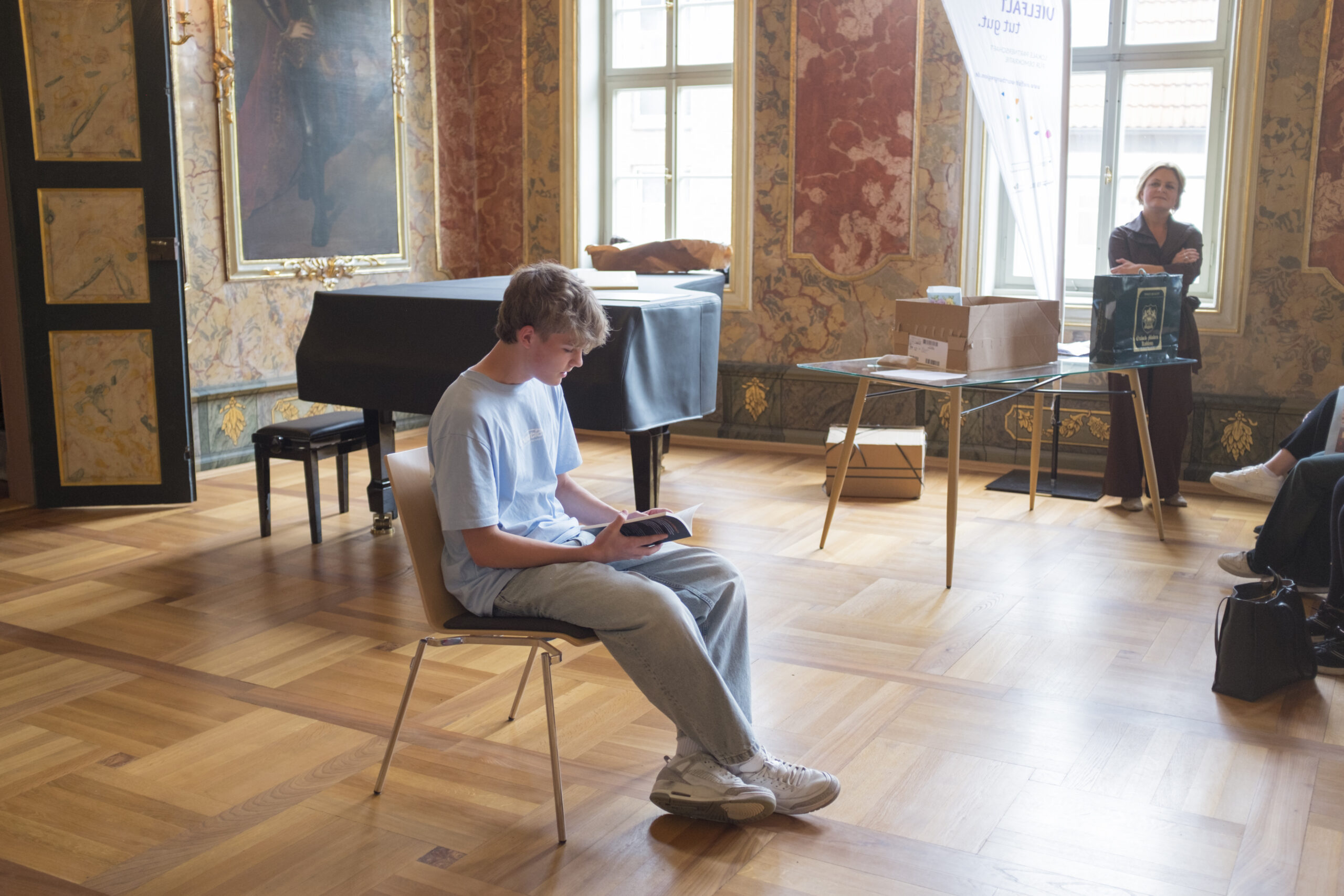 Zwei Jungautoren – von jeder Einrichtung einer – lesen ihre bestenTexte vor: Die Gasmaske (Felix Witticke) und Brief an mein Zukunts-Ich (Andrew Bauer). Vielleicht wird man noch von ihnen hören, ich könnte es mir vorstellen. Ihr total verdienter Applaus sei ein Appetizer für die Lesung am 26. Juni in der Stadtbibliothek.