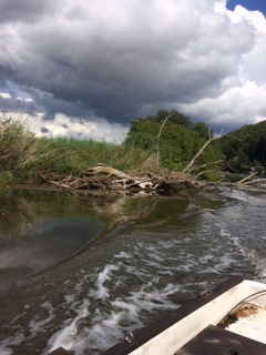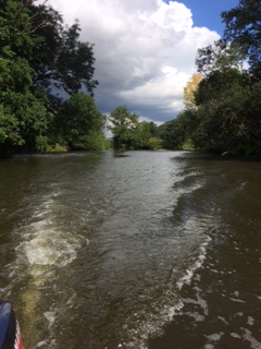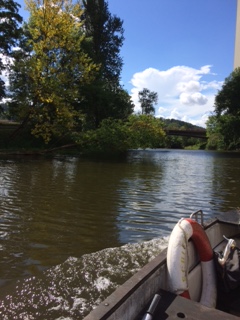 Dienstag, Eisenach. In Bischofsroda kann man noch LPGs sehen. PM und Tov sind von meinen romantischen, noch von DDR-Romanen geprägten Vorstellungen genervt. Sie sagen Kolchose, was abwertend gemeint ist. Sie finden die grauen Riesengebäude eher langweilig und verstehen nicht, warum ich sie sehen will. Tovs Boot heißt Lotte U. Die Lotte U. ist ein in die Jahre gekommenes, aber stabiles Gefährt und wird von einem 8-PS-Yamaha Außenborder betrieben. Der hat seine Mucken. Zum Glück hat Tov die Sache im Griff, er ist Ingenieur. Wir cruisen die Werra hoch. Die Sonne scheint, die Wiesen gleiten vorbei, die Landschaft ist unbeschreiblich. Das ganze Werratal steht unter Naturschutz. Tov bzw. Steff – der da sehr großzügig ist – hat ein verzaubertes Grundstück direkt am Ufer geerbt, wo die Lotte U. festgemacht ist. Ziemlich runtergekommen, das Wochendhäuschen mit kleiner Bootsanlegestelle, aber toll. Am liebsten würde man sich sofort einquartieren. Alte Obstbäume, Wasser, Wiesen und unendliche Ruhe.
