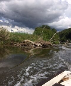 Dienstag, Eisenach. In Bischofsroda kann man noch LPGs sehen. PM und Tov sind von meinen romantischen, noch von DDR-Romanen geprägten Vorstellungen genervt. Sie sagen Kolchose, was abwertend gemeint ist. Sie finden die grauen Riesengebäude eher langweilig und verstehen nicht, warum ich sie sehen will. Tovs Boot heißt Lotte U. Die Lotte U. ist ein in die Jahre gekommenes, aber stabiles Gefährt und wird von einem 8-PS-Yamaha Außenborder betrieben. Der hat seine Mucken. Zum Glück hat Tov die Sache im Griff, er ist Ingenieur. Wir cruisen die Werra hoch. Die Sonne scheint, die Wiesen gleiten vorbei, die Landschaft ist unbeschreiblich. Das