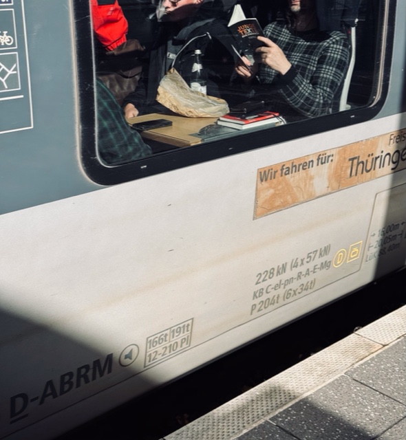 Dienstag. Warte ich auf dem Bahnsteig und schaue einem abfahrenden Zug hinterher, und plötzlich entdecke ich durchs Fenster mein Buchcover. Das passiert nicht alle Tage: Ganz gechillt mit Brötchentüte und Wasserflasche liest da einer die Jungen Texte aus Eisenach. Sieht aus, als gefällt’s ihm.